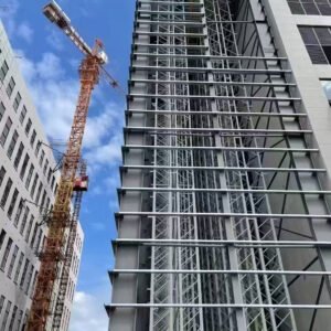 Lift installation: Lift towers erected; carriages installed; guide rails aligned; safety systems verified